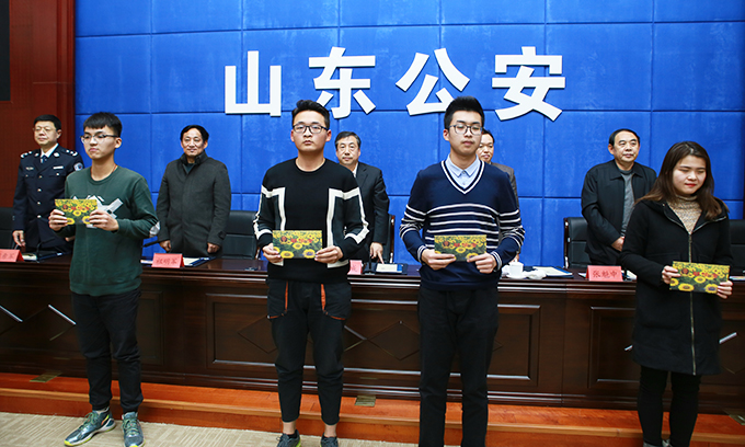 12月23日下午,由山东省人民政府、山东省公安厅、省慈善总会、省民政厅、省公安民警优抚基金会联合举办的“公安英烈子女录警·金盾助学助困暨企业捐赠活动仪式”在省公安厅正式启动,山东省副省长、公安厅厅长孙立成,省公安厅党委委员、副厅长闫希军,省民政厅党组成员、副厅长张魁中,省公安厅党委委员、政治部主任修春清,省烟草专卖局党组书记、局长吴洪田,省公务员局副局长于顺水,金天国际董事局主席祖明军,省公安民警优抚基金会理事长姜永梅等领导出席,各市公安局、各直属公安局、济南铁路公安局政治部、厅直各单位、2016新录公安英烈子女及家长、受助学生及民警代表共150人参加了本次仪式。