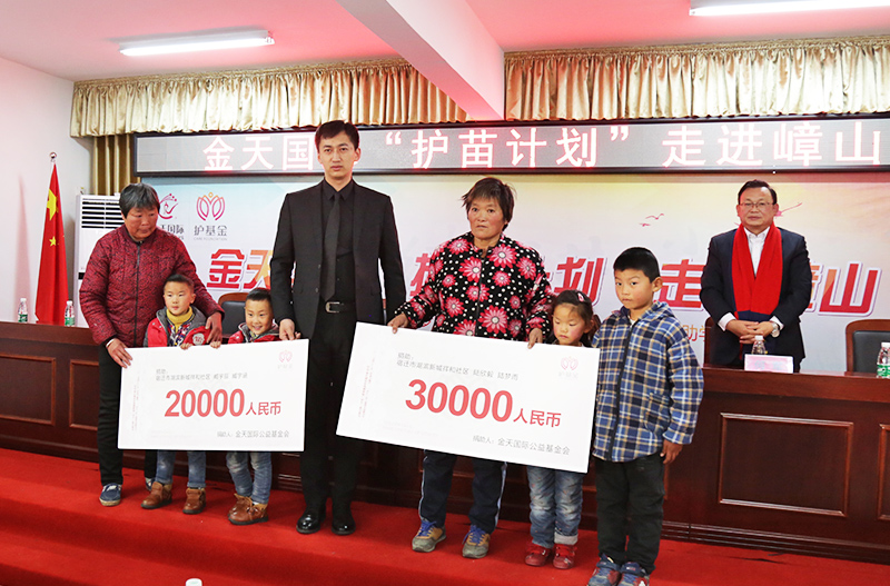 伴随着“金天国际号”高铁品牌专列的全速启程,把健康之爱传向四方。11月30日下午,承载着爱与希望,金天国际“公益护苗计划”走进嶂山,为嶂山因贫失学的“贫困儿童”进行精准救助与关爱。宿迁市湖滨新区祥和社区党委书记刘邦超,宿迁市湖滨新区管委会副调研员、扶贫办主任王益军,金天国际公益基金会理事长祖威,金天国际公益基金会秘书长何军,金天国际公益基金会常务理事樊保宏及金天双创市场理事会理事,嶂山实验幼儿园老师、受助学生、社区乡亲们及宿迁电视台、宿迁日报近100人齐聚魅力嶂山,感受浓浓的金天情。