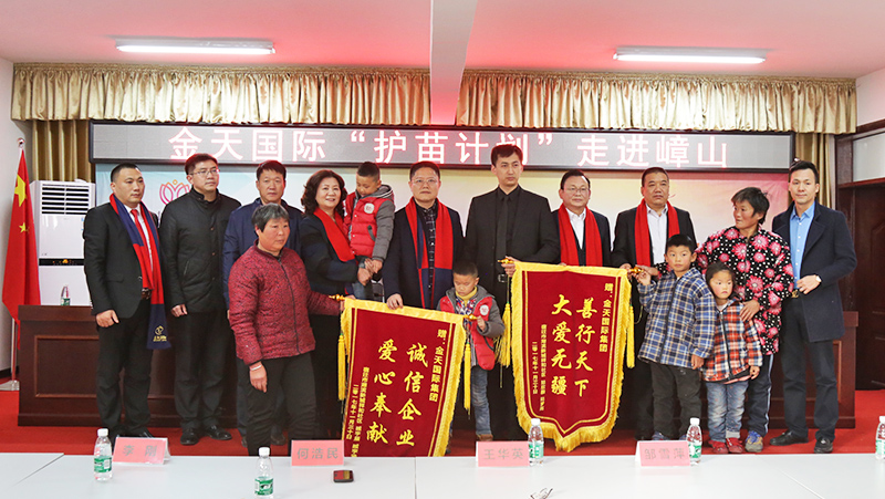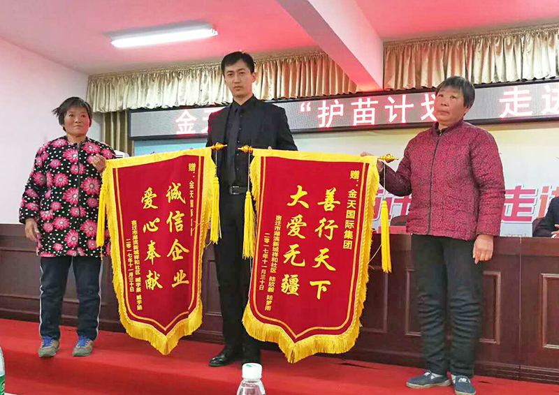 凝聚爱心护苗茁壮成长。捐赠现场,金天国际公益基金会理事长祖威代表金天国际“护基金”向受助孩子捐赠善款及学习用品。感怀企业善举,受助孩子家长亲自上台向金天国际回馈“诚信企业,爱心奉献”及“善行天下,大爱无疆”锦旗,以示感激之情。